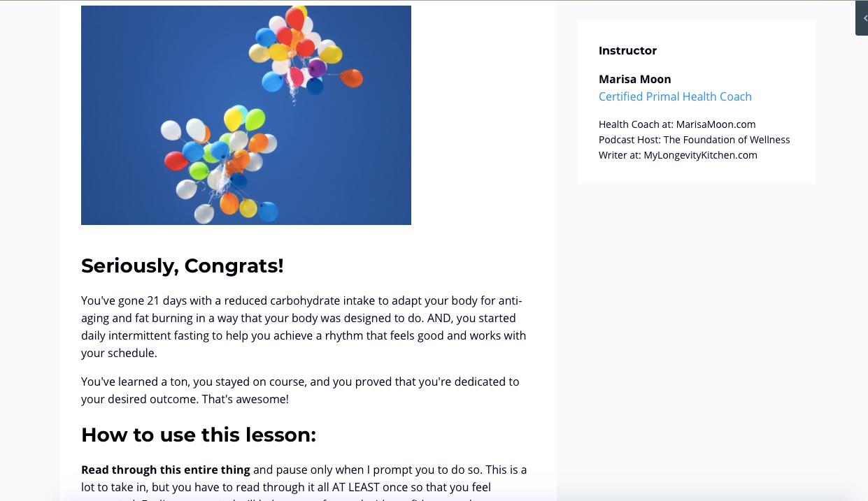 After completing module 6, you will be invited to schedule your free wrap-up coaching call with I.F. Freedom instructor, Marisa Moon. This is a private health coaching session to provide you with plenty of goal-setting advice and mentoring to help you succeed after the course.